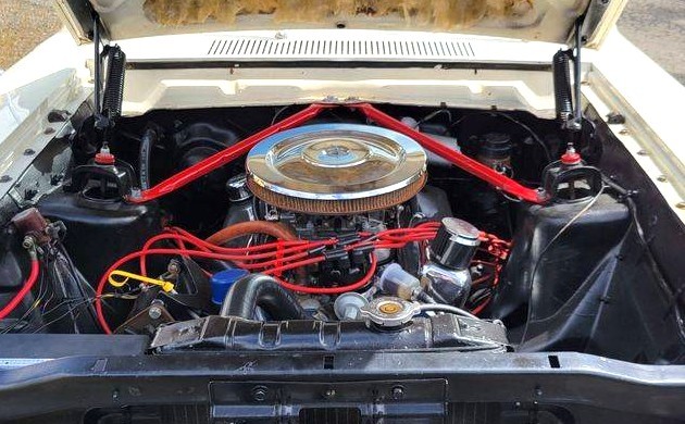 Looks like they woke up the V8 with an aftermarket aluminum intake, Edelbrock 4-barrel carb, headers and dual exhausts. All of which should make it fun with the 3-speed manual. Especially if it’s a 260, which seems likely.