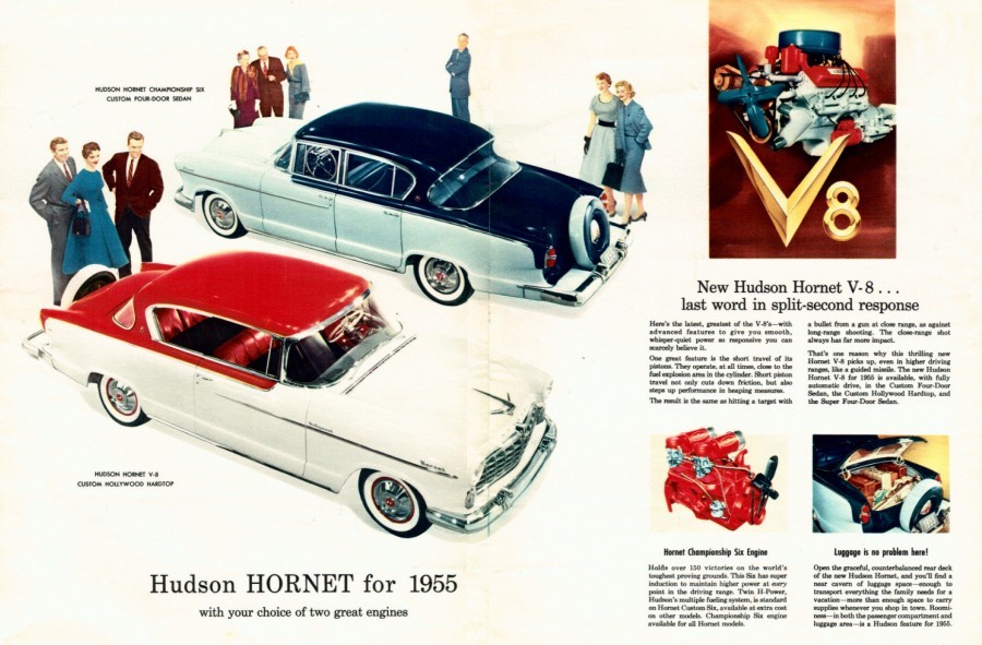 Ron- The ’54 Hornet’s only engine was the 308. Over the ‘stepdown’ years, the Wasp had the 262, and the Pacemaker the 232. The compact Jet had a 202.
