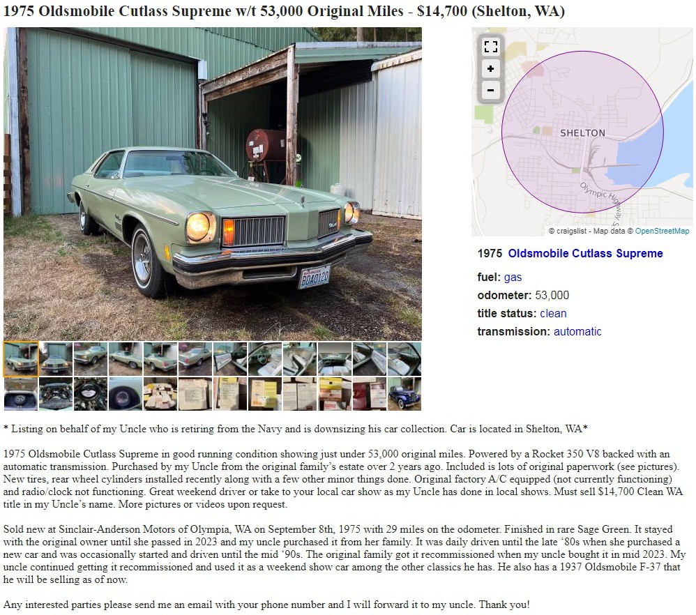 The seller is listing this incredible survivor 1975 Oldsmobile Cutlass Supreme for their uncle, a U.S. Navy vet who is retiring and downsizing his car collection. First of all, please thank your uncle for us for his service, and then please tell him he has good taste; this car is beautiful! They’re posting it here on craigslist in Shelton, Washington, and they’re asking $14,700. Here is the original listing, and thanks to Curvette for the tip!