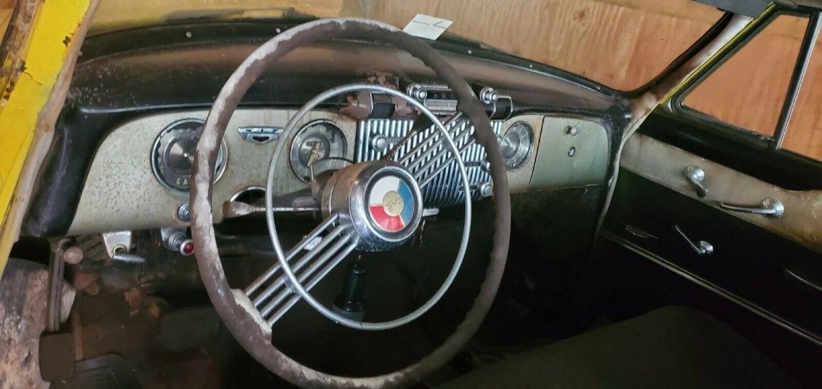 Although the photographs in this listing aren’t the best from an analysis point of view, I find them very attractive (Scotty G, I’m sure you could do better). The slightly faded yellow paint and accumulated dirt mask how spectacular this car must have looked at one point. I have no idea if the striking color combination is original or not, but to quote the original 1953 Buick brochure the Special was available with “Gorgeous colors” and “rich fabrics and trim.”