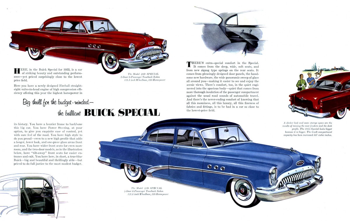It might surprise you that the Buick “Special” was actually the lowest-cost Buick in the line. It was Buick’s Golden Anniversary (50th) in 1953 and there was a major effort put into the celebration — and the Special was not left out. This particular car is a 48D Special, also known as a six-passenger “Tourback” sedan. You can see one in the upper left corner of this 1953 Buick brochure. The Special was the only Buick passenger car that still used the Fireball 130 horsepower straight-eight engine; the rest had moved on to a V-8 configuration.