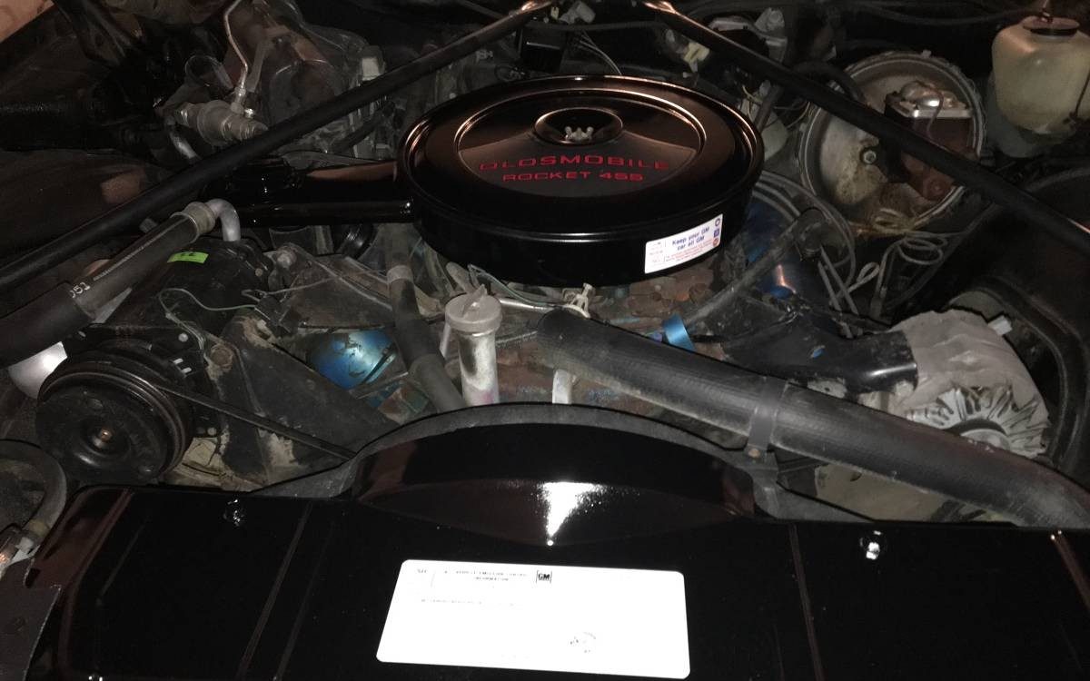 The Oldsmobile is fitted with a 455ci V8 engine and a THM-400 automatic transmission. Also included are power steering, power brakes, and air conditioning. Under the hood looks really clean, and the car has recently received a new A/C compressor, new master cylinder, and new tires.