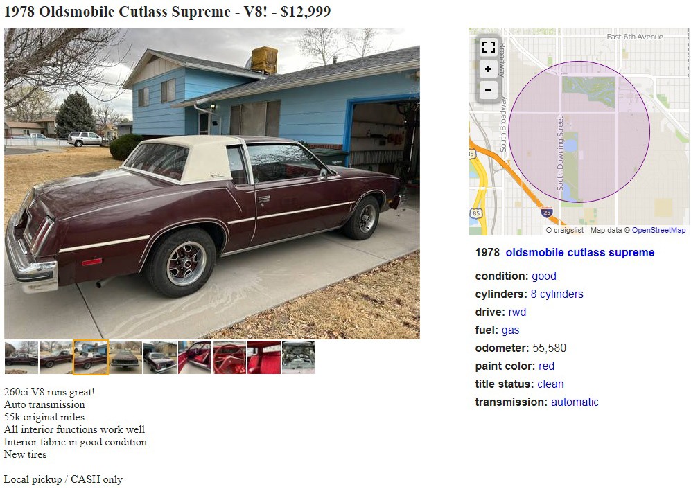 We’ve seen 13 examples of the 1978 Oldsmobile Cutlass here on Barn Finds over the years, and seven of them have been the unusual sloped-back Salon model. I never remember seeing those as a teenager, but I remember seeing a ton of this two-door Cutlass Superme body style. This one can be found here on craigslist in Denver, Colorado, and the seller is asking $12,999. Here is the original listing, and thanks to Mike F. for the tip!