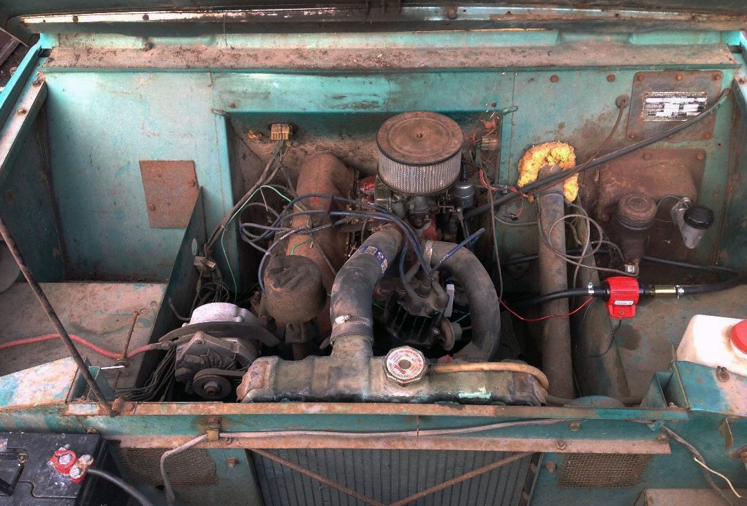 I thought that roll-up windows started in 1963 but maybe not? I-H made about 100,000 of these Model 80 Scouts between 1961 and 1965 with four different top configurations. I’m assuming that these olive-green seats have been reupholstered and the seller has included a few detail photos showing the rust on the floors.