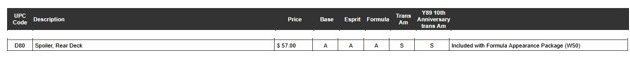 210CayenneGTS – I just pulled up the 1979 order form and you are right! It appears to show that a Formula buyer could order a rear spoiler (RPO D80) individually but if you order the RPO W50 package, it included the rear spoiler. See the note to the left of the attached. I appreciate you handling this discussion so pleasantly.