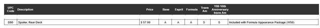 Tom, you are correct. The spoiler was optional on the Formula and had to be ordered by checking RPO code D80 at $57.