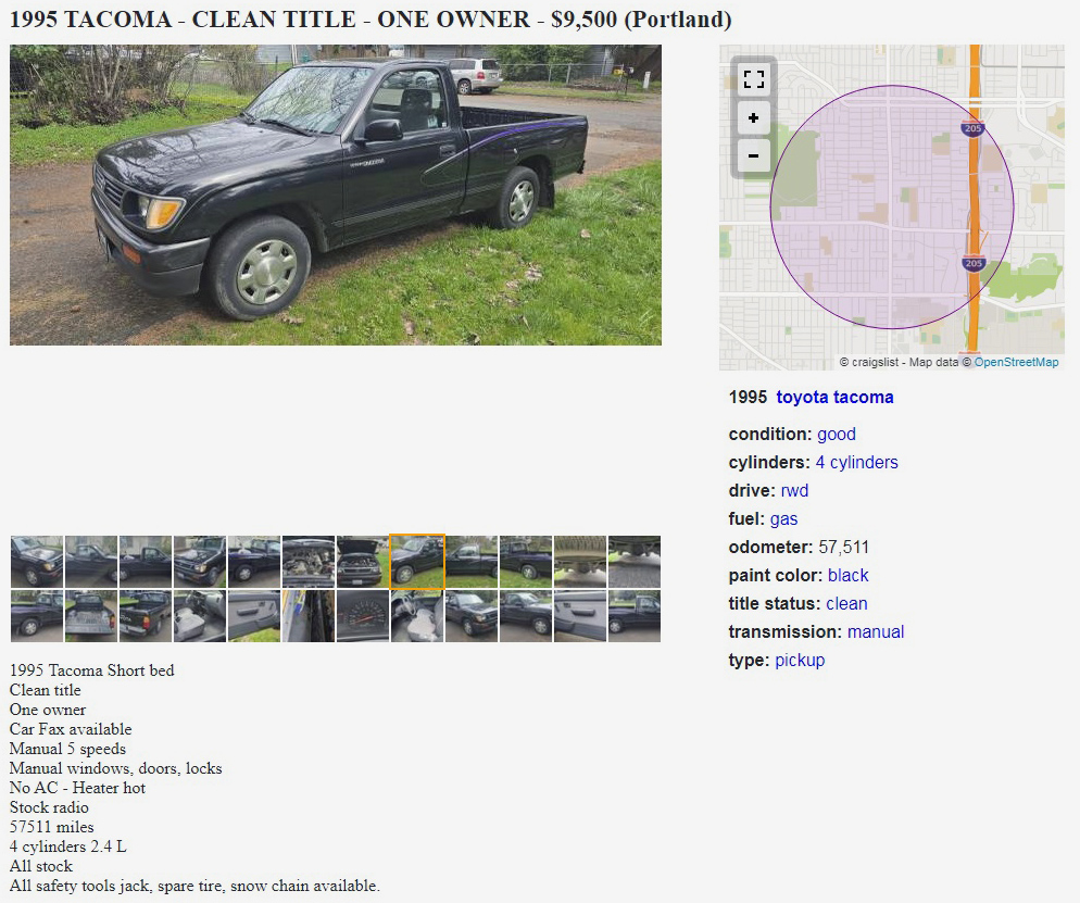 So many little trucks, so little time, so little money. I like little trucks, which isn’t surprising to any of you. This 1995 Toyota Tacoma is a little bed, I mean, short bed model with a 5-speed manual, it’s posted here on craigslist in Tacoma, Washington, and the seller is asking $9,500. Here is the original listing, and thanks to Curvette for another great tip!
