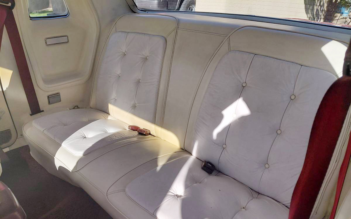 No power windows! I’m always surprised and bummed to not see power windows in a luxury car, but it was still the 1970s, and they weren’t standard as they are now in almost every vehicle. A friend of mine just bought a new Honda Gold Wing (not cheap!), and it has a power “windscreen,” which is crazy. The white “Corinthian leather” (direct from New Jersey) seats in this car look good, but are showing wrinkles (direct from my face), and the driver’s side is basically toast. The back seat looks fantastic.