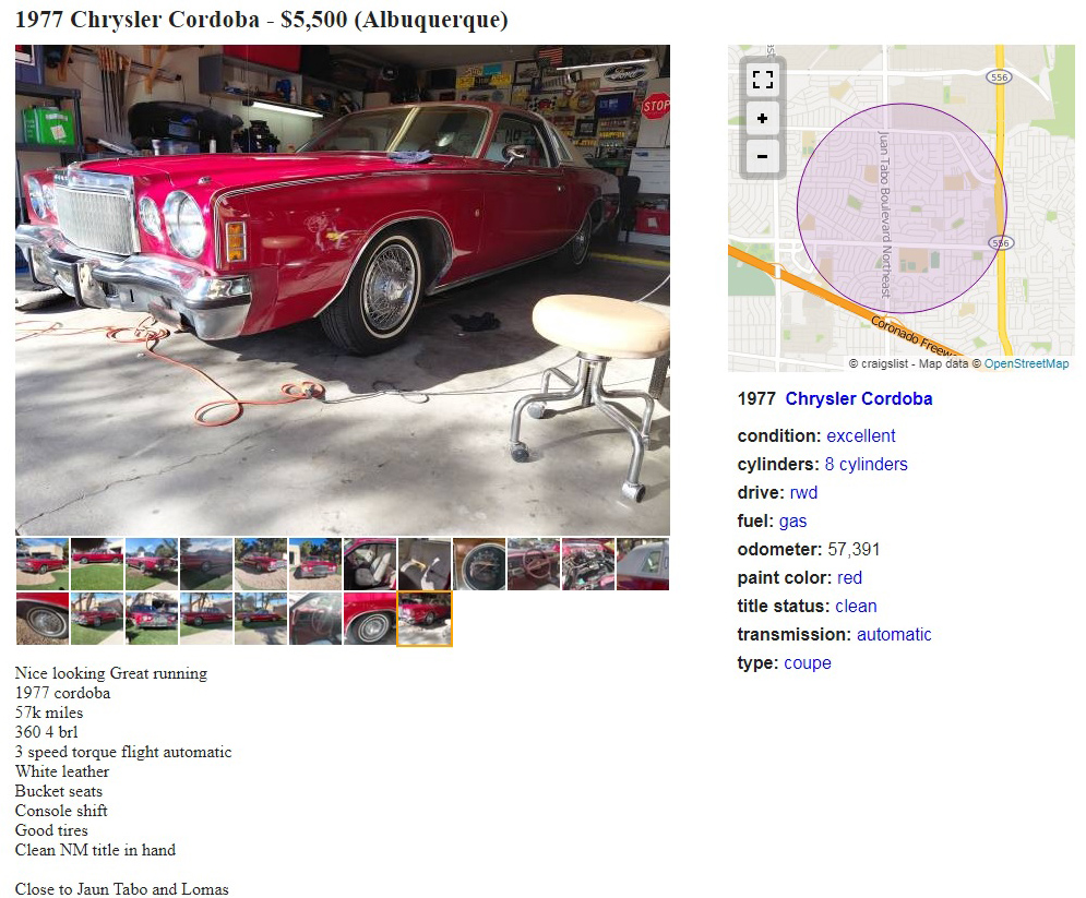The seller of this Claret Red 1977 Chrysler Cordoba lists the mileage as being 57,391 miles, and any car or truck with fewer than 100,000 miles always gets the stink eye, as far as the comments go. It’s impossible to tell things like the wear on the brake pedal in the photos, but you can check them out here on craigslist. It’s located in one of my favorite cities: Albuquerque, New Mexico. The seller is asking $5,500, here is the original listing, and thanks to Jack M. for the tip!