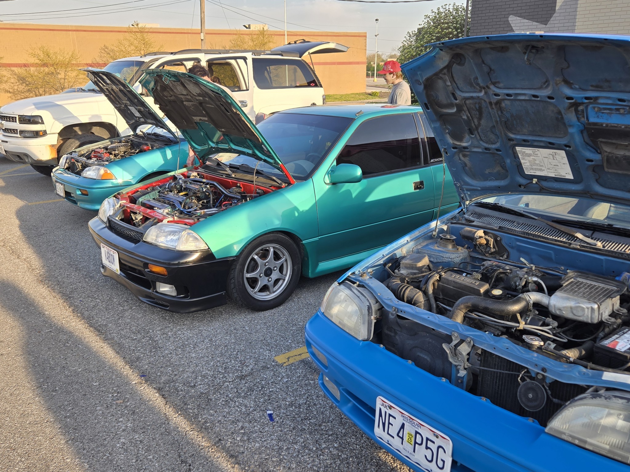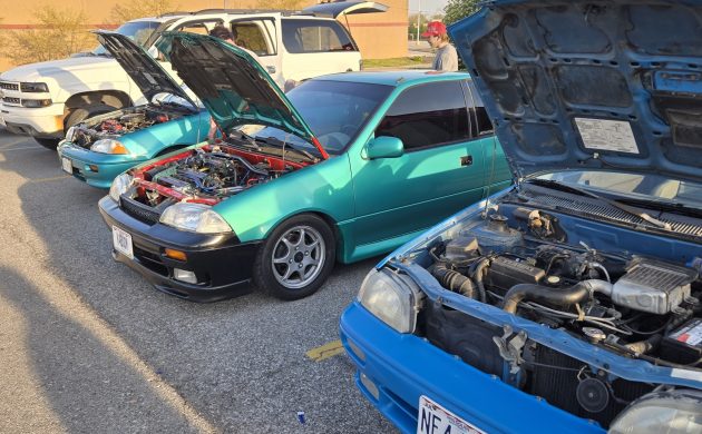 As a Metro owner for the past twenty-four years, lots of people add and subtract things to these easy-to-work-on cars. If this one is an XFi, it shouldn’t have factory A/C or a right-hand mirror, but both of those could have been added. I’ve Euro-spec’d mine as well as added all sorts of features. Here’s a pic from this past weekend. We had three Metros at the show, mine, a naturally-aspirated 3-cylinder convertible, a Swift GT clone with the twin-cam 4-cylinder, and an actual Canadian Swift with the turbo 3-cylinder.