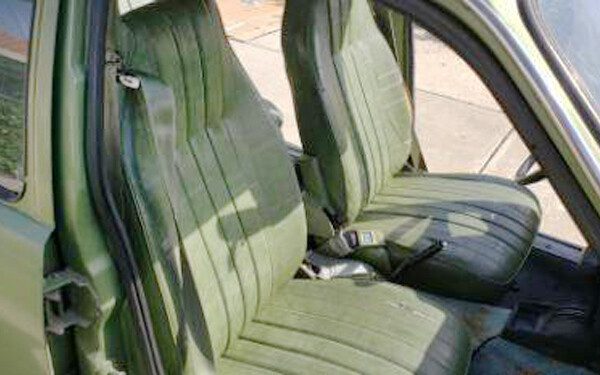 The seats look good but the seller says that there are a few splits in the seams of the driver’s seat, and I wish they would have been a nice green plaid fabric. Sadly, there was no plaid fabric available for this car, and no green fabric at all, just green vinyl. The back seat looks great as does the rear cargo area.