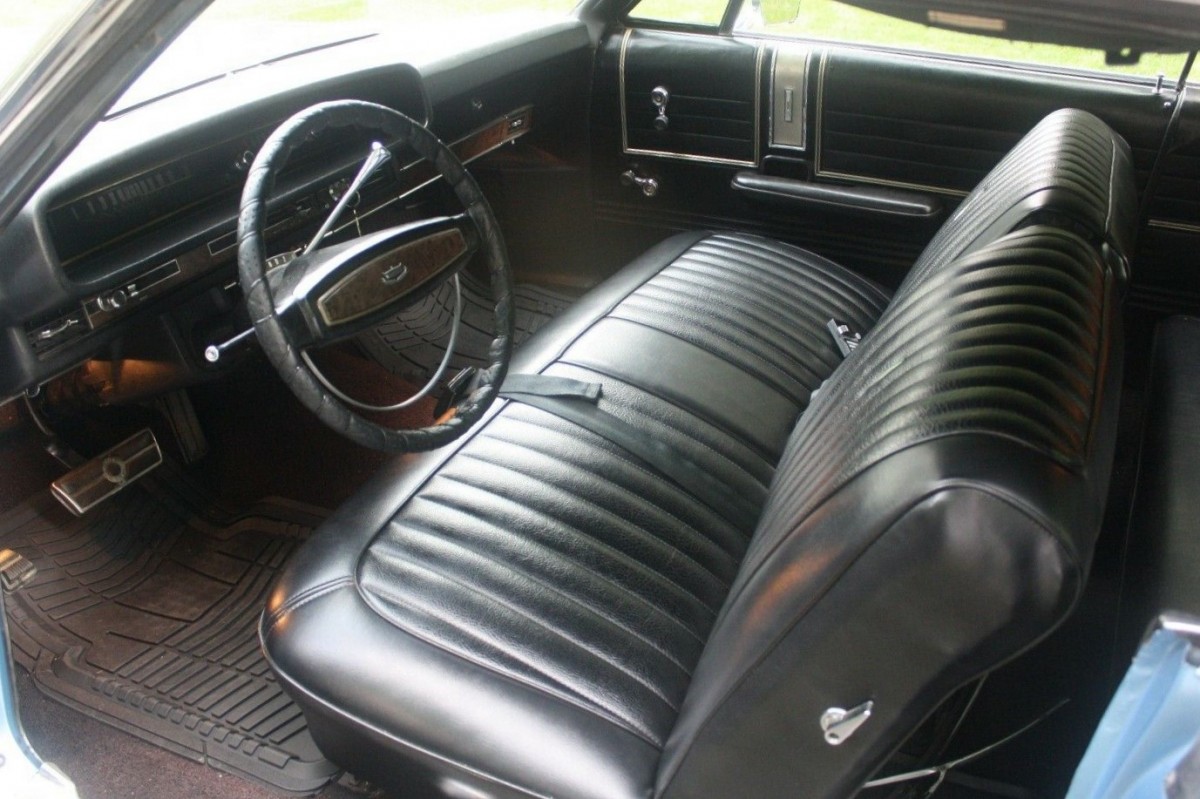 Inside the car, there are no disappointments at all. The seats are covered in black vinyl and are free of any imperfections as well as the dash. The only thing that could possibly be detracting is the aftermarket steering wheel cover. More modern floor mats are included as well. This car has power steering, power brakes, and factory air conditioning.