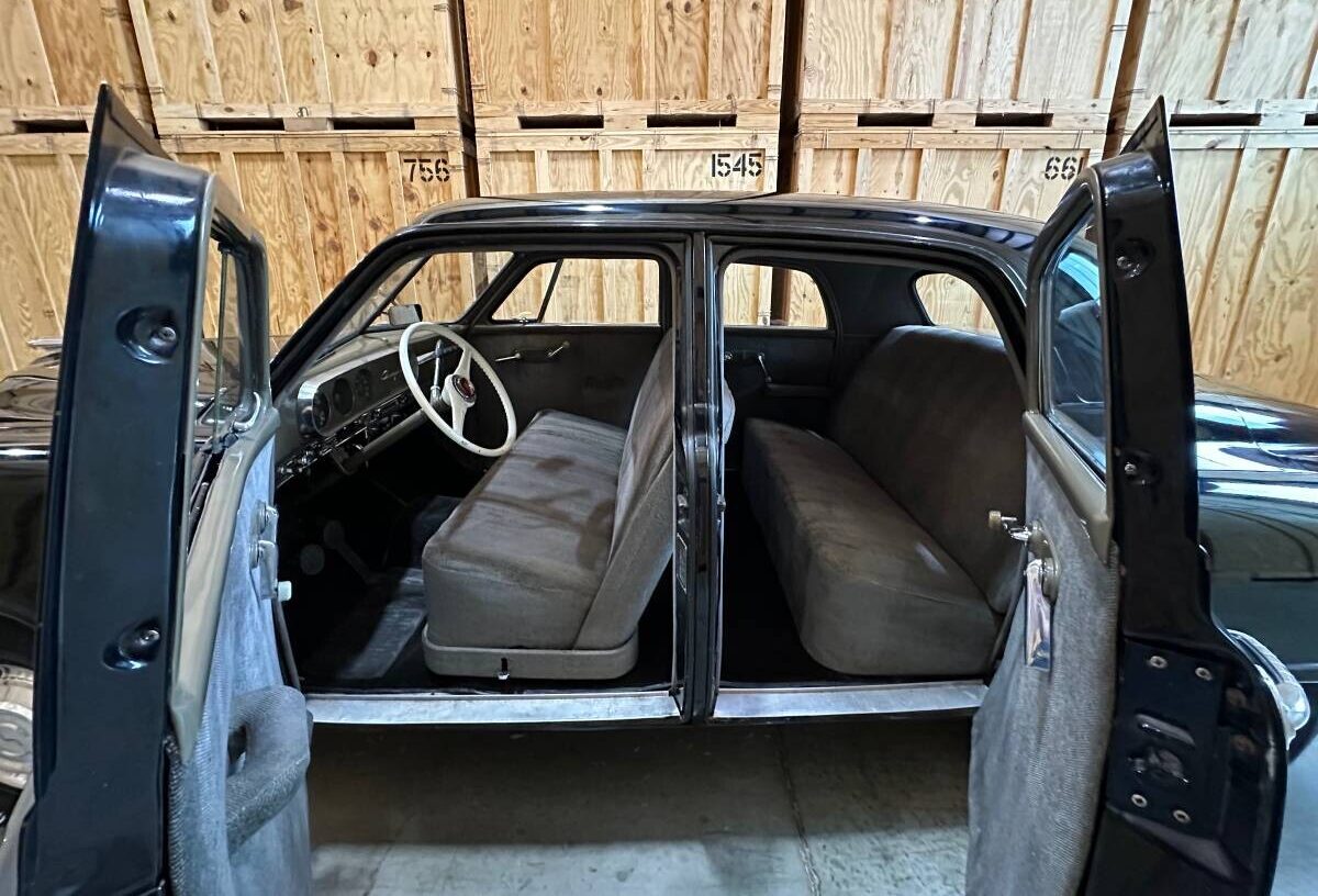 Suicide doors open into the Champion’s cockpit that has a cool steering wheel, a modern dash, and a new “Aircraft-type black light instrument panel.” (Studebaker’s sales literature claimed these non-glare dials were easier to read at night based on “A scientific wartime development for the safety and efficiency of U.S. flyers”). I wish there were more detailed photos, but from those supplied, the gray cloth seats and door panels are in great shape. I’d assume the headliner and carpet are presentable as well.