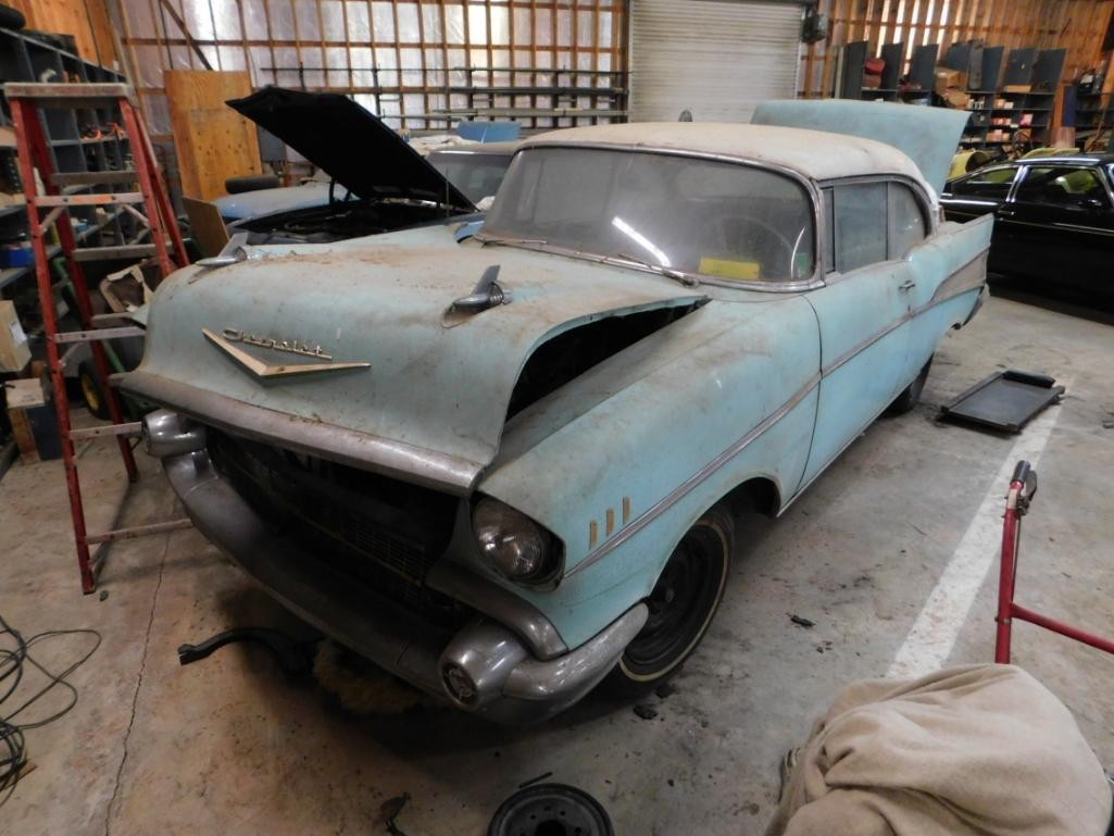 Th ’57 Chevy took quite a whack, but could be better than it looks. Engine compartment still looks pretty square.