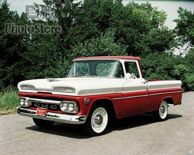 Back to this truck. If this sported an eyebrow hood (’60-’61) and torsion bar front suspension I’d get some dirty looks from my wife as I packed to go and get this beast. My dad had a ’61 Chevy pickup with the narrow box and the ultra-boring option of NO options (well, it DID have heavy duty wheels), but we had a neighbor who went out and bought a fully-loaded wide box GMC. It was 2-tone red and white (like the GM promo picture I attached) and it had chrome everywhere. Park one like that on my driveway and I’d think I won the lottery.