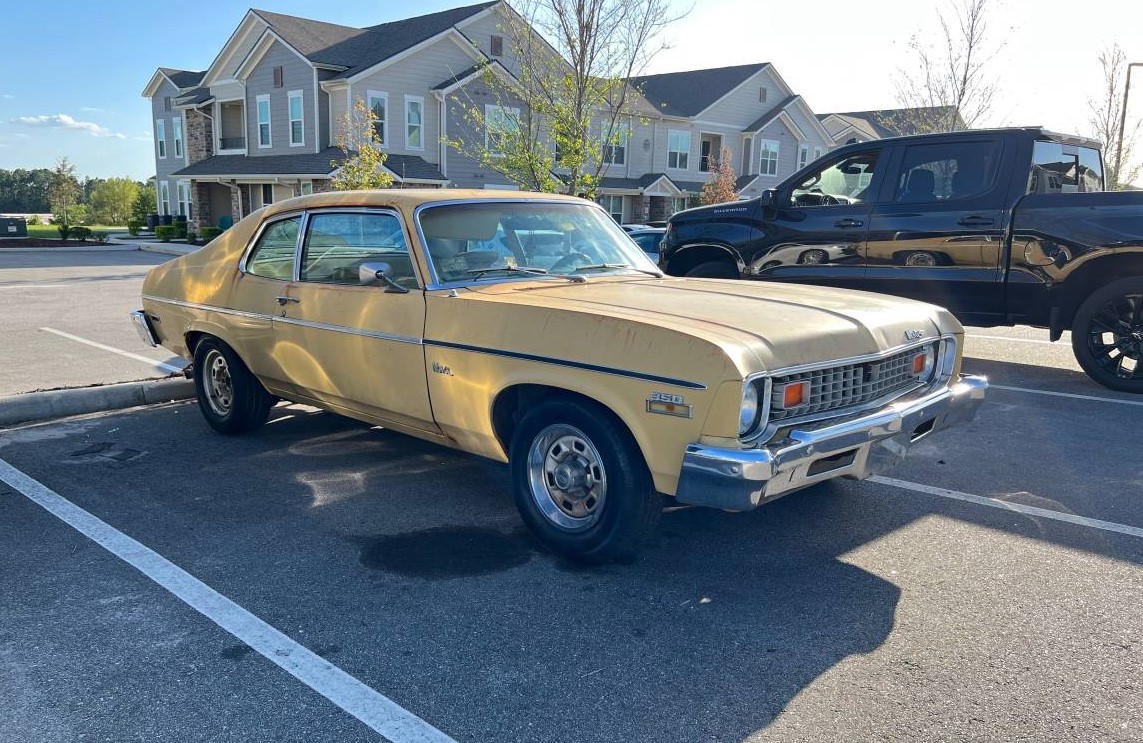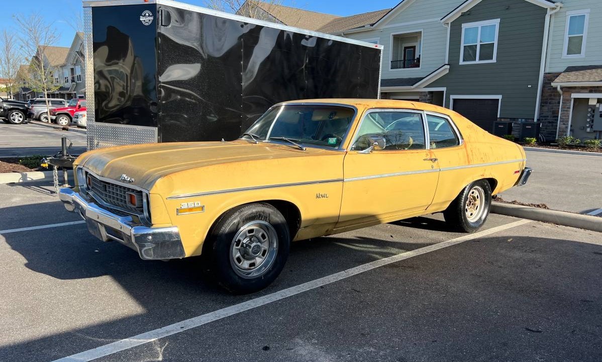 From a sales perspective, third-generation Nova’s were the most successful (losing the Chevy II designation to the Nova in 1969). This batch was built from 1968-74 and accounted for more than two million automobiles. The 1973-74 models received a noticeable facelift, in part to accommodate bigger bumpers fore and aft and the addition of a 3-door hatchback to the coupe. Buyers still couldn’t get enough of the cars and 1973 would be its 2nd best year at 369,500 units, of which 104,000 had the L65 350 cubic inch V8 (145 hp SAE net) like in the seller’s car.