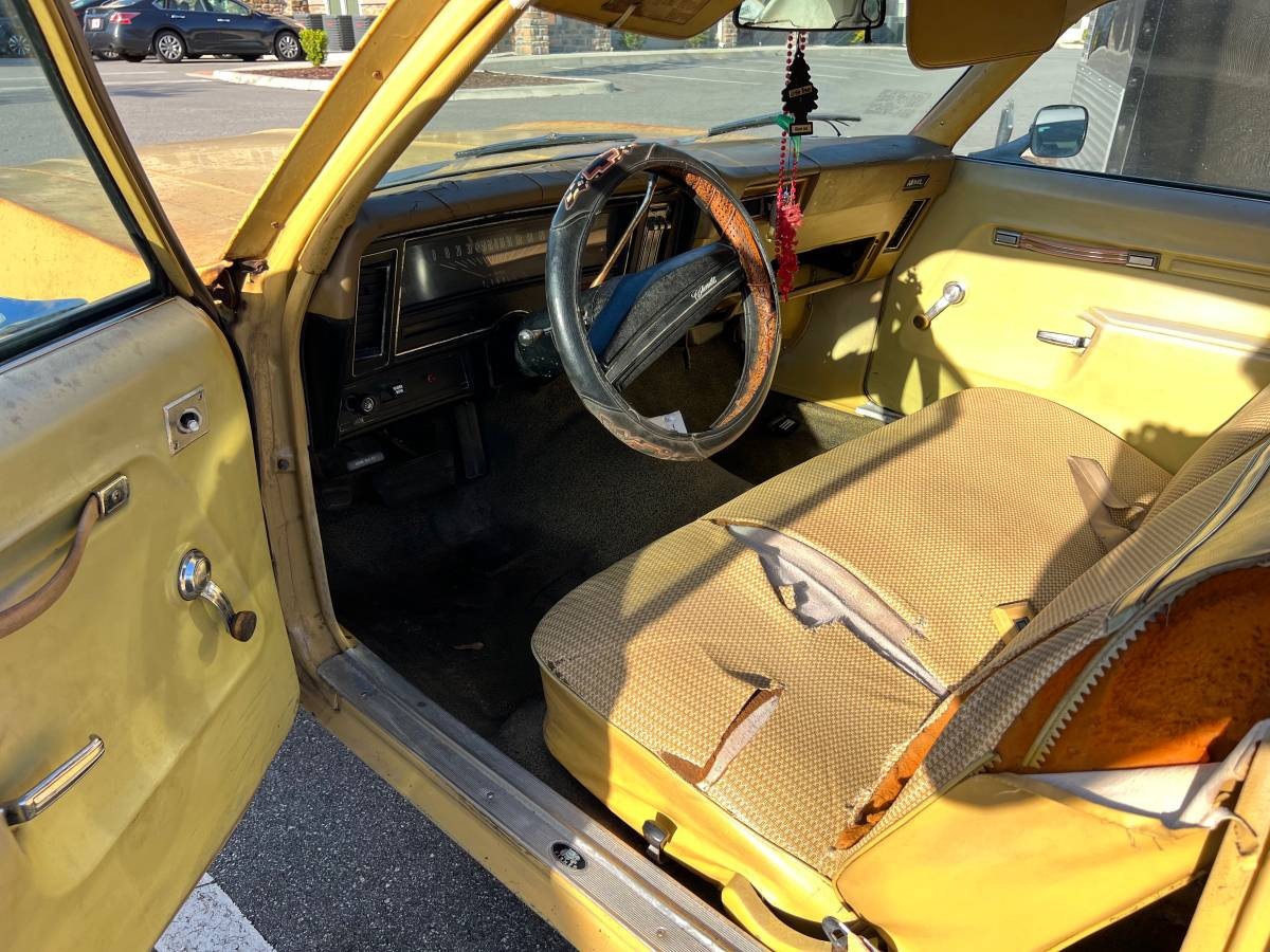This ’73 apparently was a single-owner auto until recently. It’s been dormant for umpteen months and has just 60,000 claimed miles to show for it. We get the impression that it doesn’t run but could with a new battery and fresh gasoline (after removing the old stuff). The body is said to be rust-free including the floor and frame, although there is likely some surface on the sheet metal. The original Beige or Light Yellow paint job has seen better days and part of the exterior side trim is missing. But the car sports Rally wheels at all four corners, though missing some brightwork.