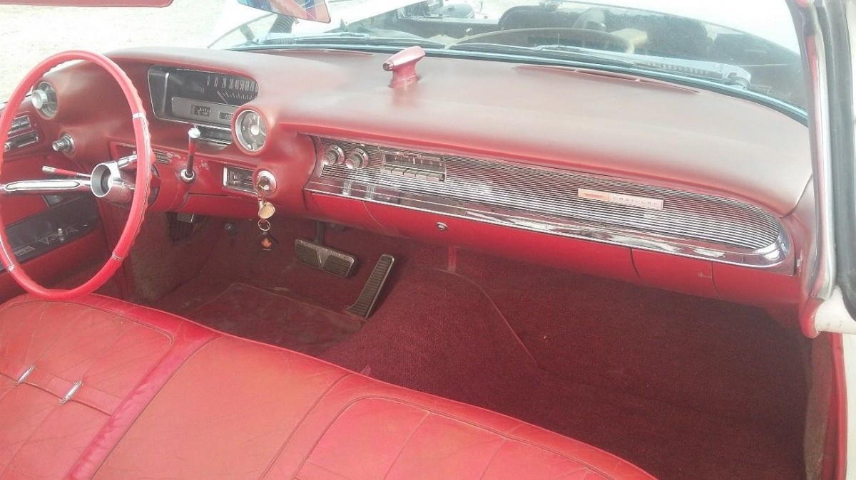 Inside the bright red interior appears to be virtually without flaw, but it is in need of a solid cleaning. There is some paint chipping around the steering column area, but remainder dash seems very nice. Also there are some cracks in the leather on the driver side of the bench, but that it to be expected for the age of the leather.
