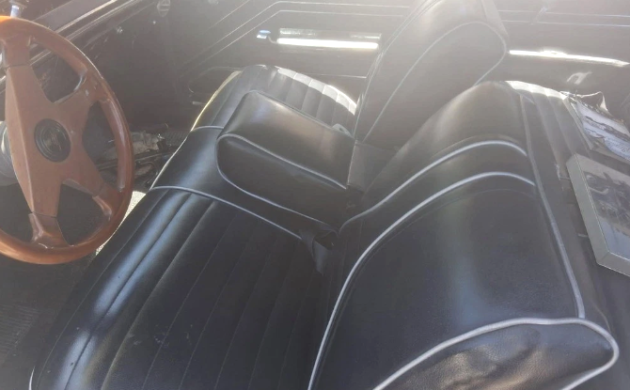 The black vinyl interior is said to be original, but the steering wheel is not. These aftermarket substitutions usually do not add to the appearance, and that’s true here (IMO). Since no claim is made regarding the silver exterior, we assume the paint has been refreshed in the past 59 years, regardless of the climate you live in.