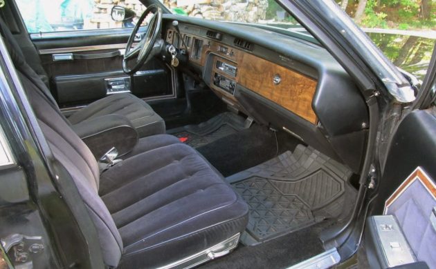 Standard fare for seating was a 60/40 split front bench seat in front and a bench seat in back, all with velour fabric. There isn’t much bolstering on the front seats, but you aren’t going to be taking corners too sharply in this car anyway; it’s meant for cruising, and the more highway miles the better. We don’t get to see the back seat at all, but it looks nice inside otherwise. The only wear that I see is on the faux wood on the steering wheel.