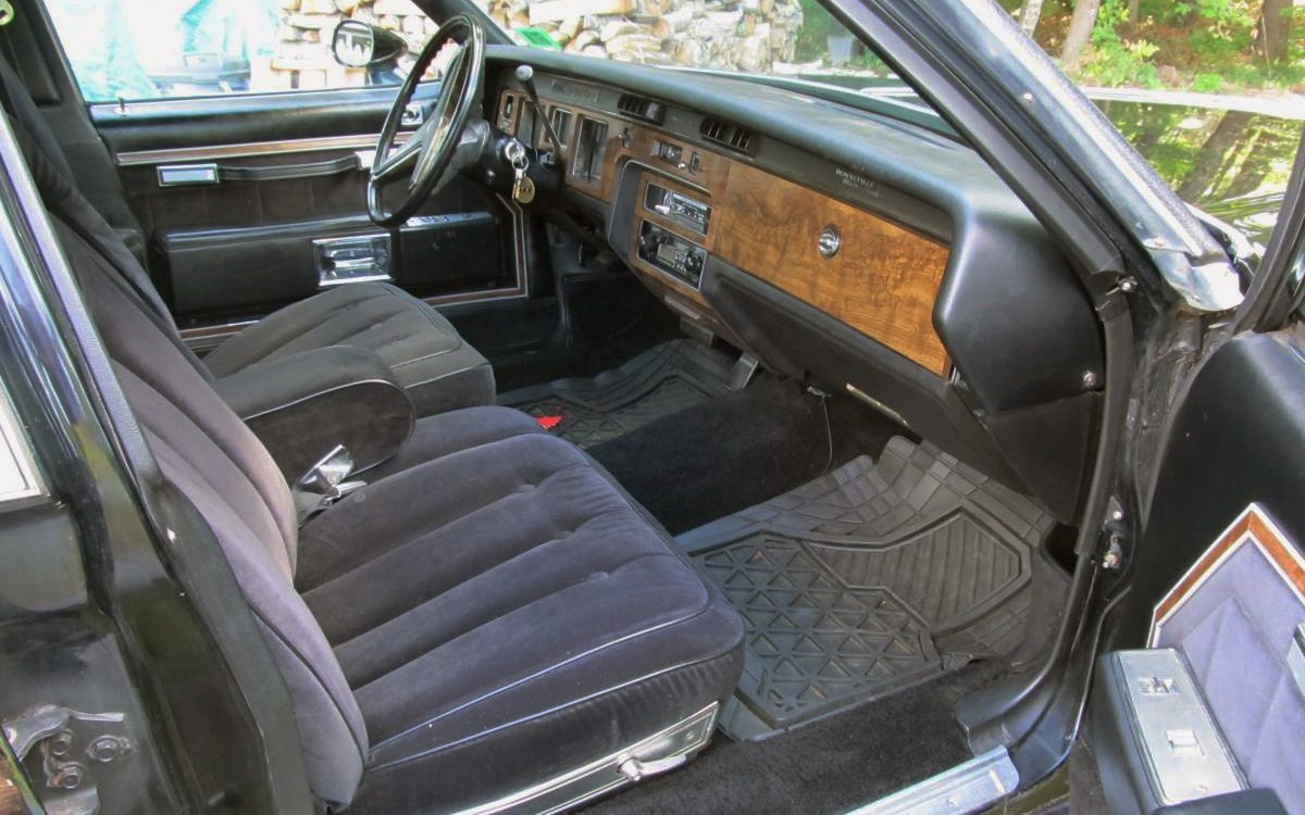 Standard fare for seating was a 60/40 split front bench seat in front and a bench seat in back, all with velour fabric. There isn’t much bolstering on the front seats, but you aren’t going to be taking corners too sharply in this car anyway; it’s meant for cruising, and the more highway miles the better. We don’t get to see the back seat at all, but it looks nice inside otherwise. The only wear that I see is on the faux wood on the steering wheel.