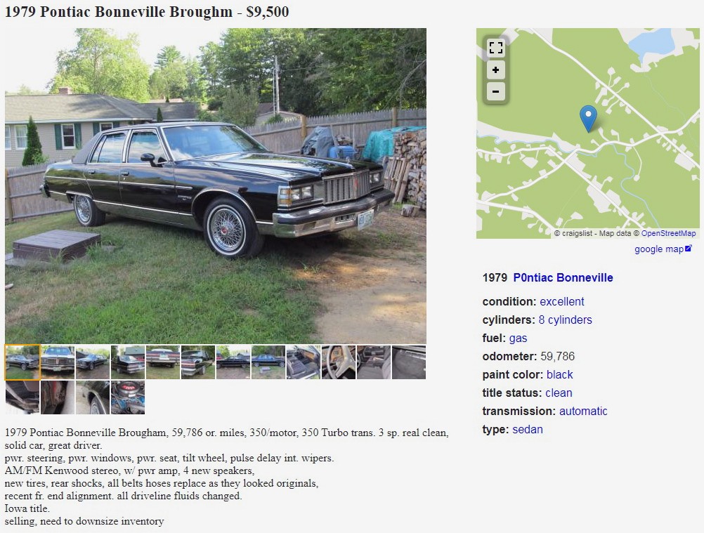 Located in the Nottingham, New Hampshire area but with an Iowa title, this 1979 Pontiac Bonneville Brougham is said to have 59,786 miles. It appears to be a low-mile car, at least as far as can be determined by the seller’s photos. The seller has this formal luxury sedan posted here on craigslist and they’re asking $9,500. Here is the original listing, and thanks to Zen for the tip!