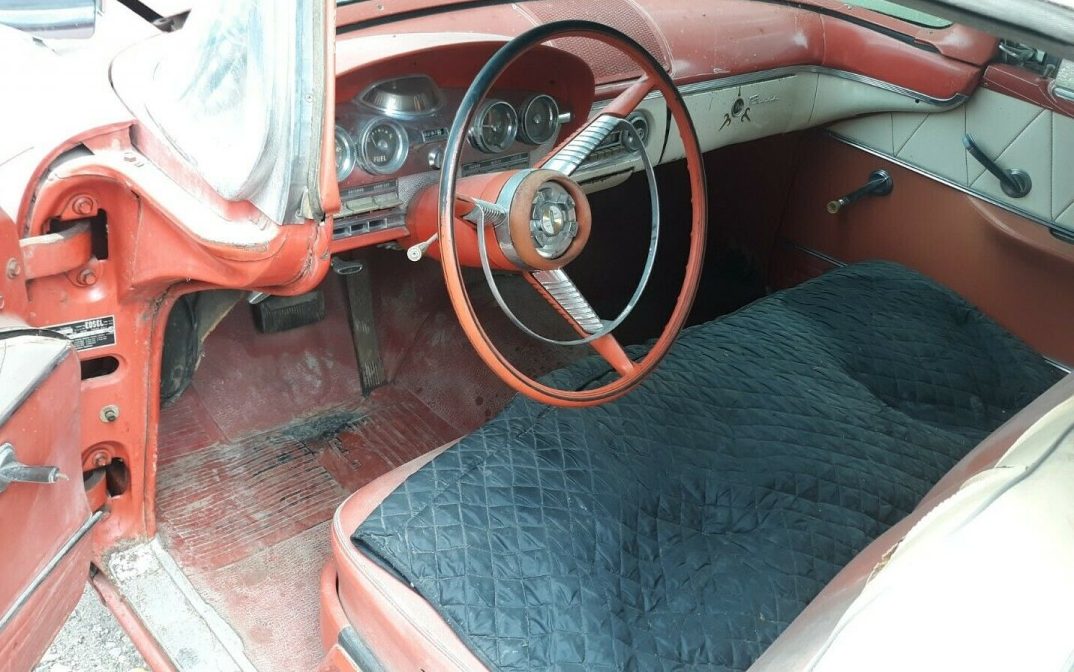 Well you know something is up with the upholstery when you have a horse blanket covering the front seat and other images do, in fact, reveal the front seat’s dilapidated condition. The rest of the interior, however, looks OK. The impressive instrument panel is intact and not particularly tarnished and you can see the “Teletouch” transmission pushbuttons located in the steering wheel center – that had to be a conversation piece back in the day. The biggest surprise, for me, is the rubber floor mat, I would have thought that an Edsel, regardless of model or trim level, would have been carpeted.