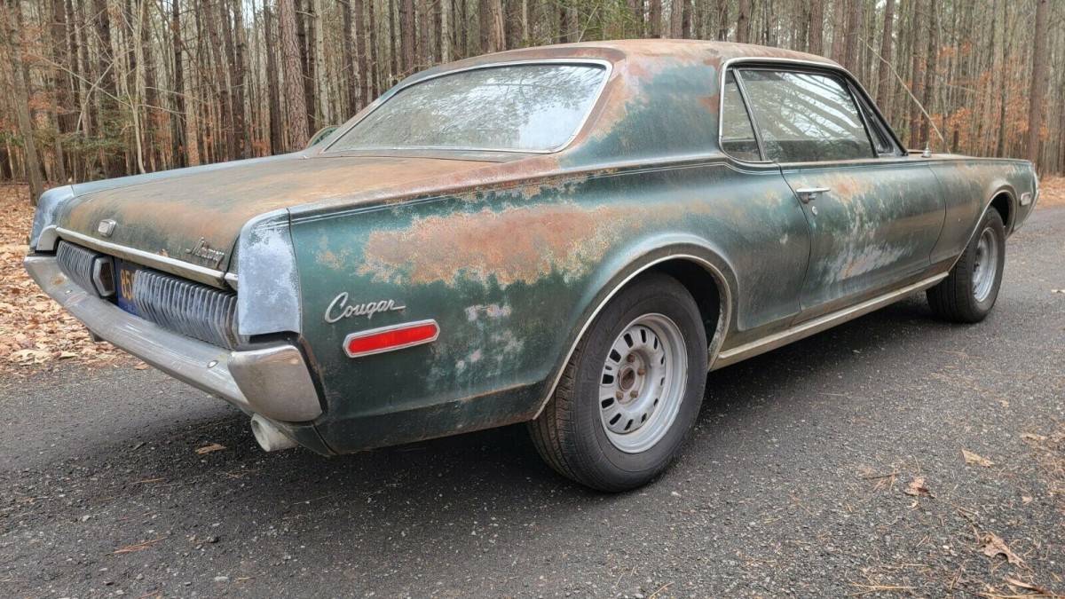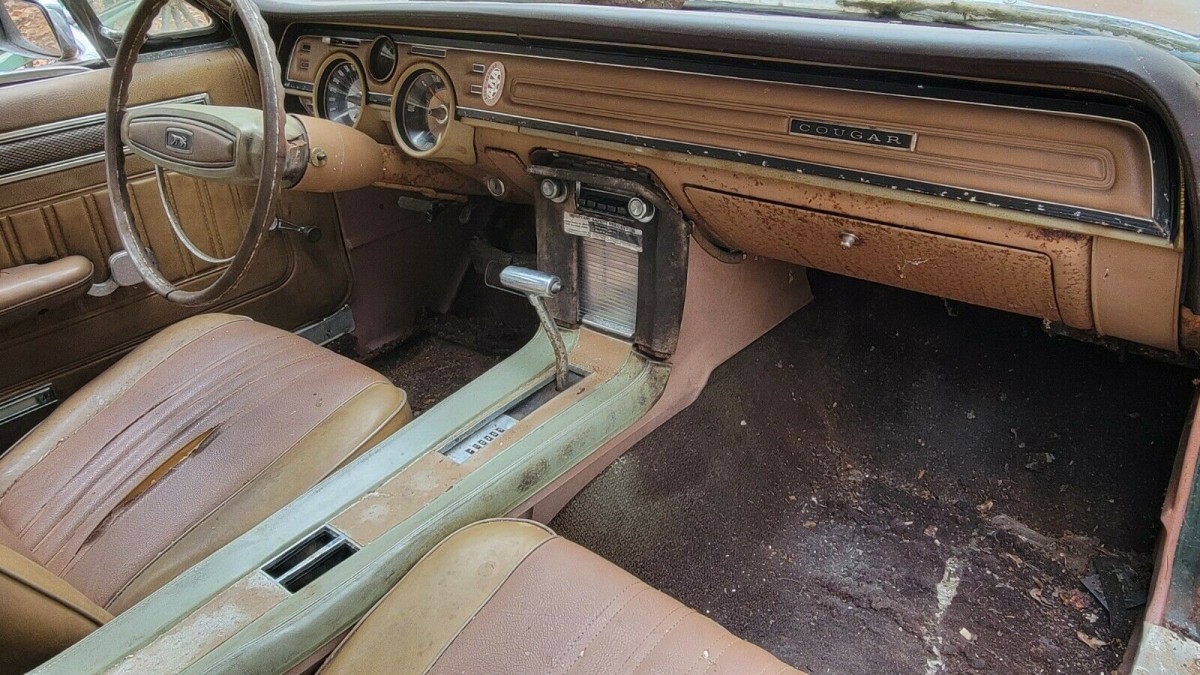 This Cougar rolled off the production line wearing Augusta Green paint. The owner believes that this remains original and that the vehicle has undergone no restoration work. It all looks pretty tired now and is in the sort of state you might expect for a car that has been idle for three decades. The buyer will probably choose to strip the panels to bare metal to remove the tired paint and surface corrosion. The surprise packet with this Cougar is its lack of significant rust. There are a few small areas in the lower body extremities, but all appear to be of the type that the next owner could address with simple patches. The floors, frame rails, and torque boxes generally look pretty good. There is rust visible in the passenger side front floor, but replacement steel is available for under $120. The exterior trim is all present, and most of it appears to be in a restorable state. With tinted glass that shows no evidence of major defects, the overall impression is this Cougar could be a rewarding DIY project.