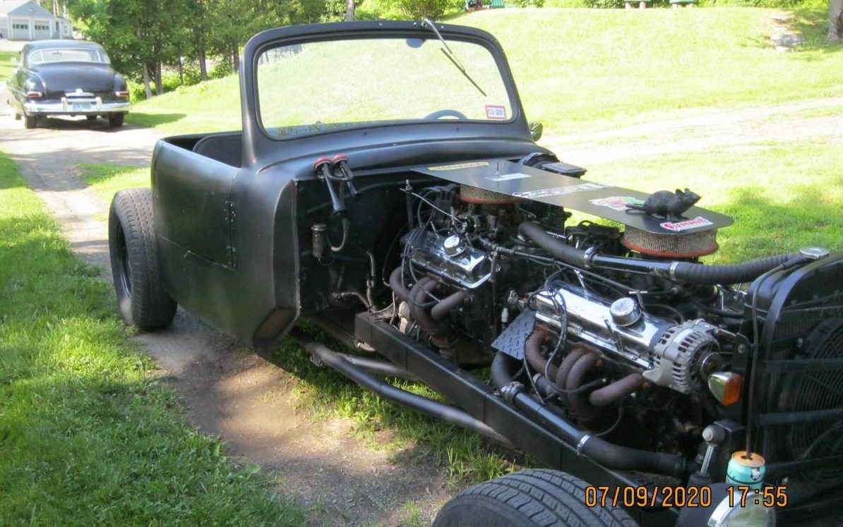 The seller tells us that the body of this creation is the cab from a ’48 Ford pickup; honestly, I can’t see it but I’ll take his word for it. I’d like to know where the frame originated, however. One thought is that it could be the Ford pickup frame with the cab relocated to the rear portion – the seller, unfortunately, does not elaborate. This custom has the layout of an old school rail – a long frame, front-engine(s), and a truncated rear. Interestingly, there is only a single door, on the passenger side, for ingress and egress.