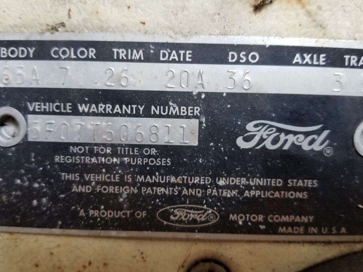 Using the data plate decoder from mustangdecoder.com reveals that this is a fairly standard car. It was built in Dearborn, Michigan and was shipped to the Louisville, Kentucky sales district. The body is a two door hard top with standard black crinkle vinyl interior. Phoenician Yellow was the exterior color, and it had a 3.20: 1 rear axle ratio. The official build date was January 20, 1965.