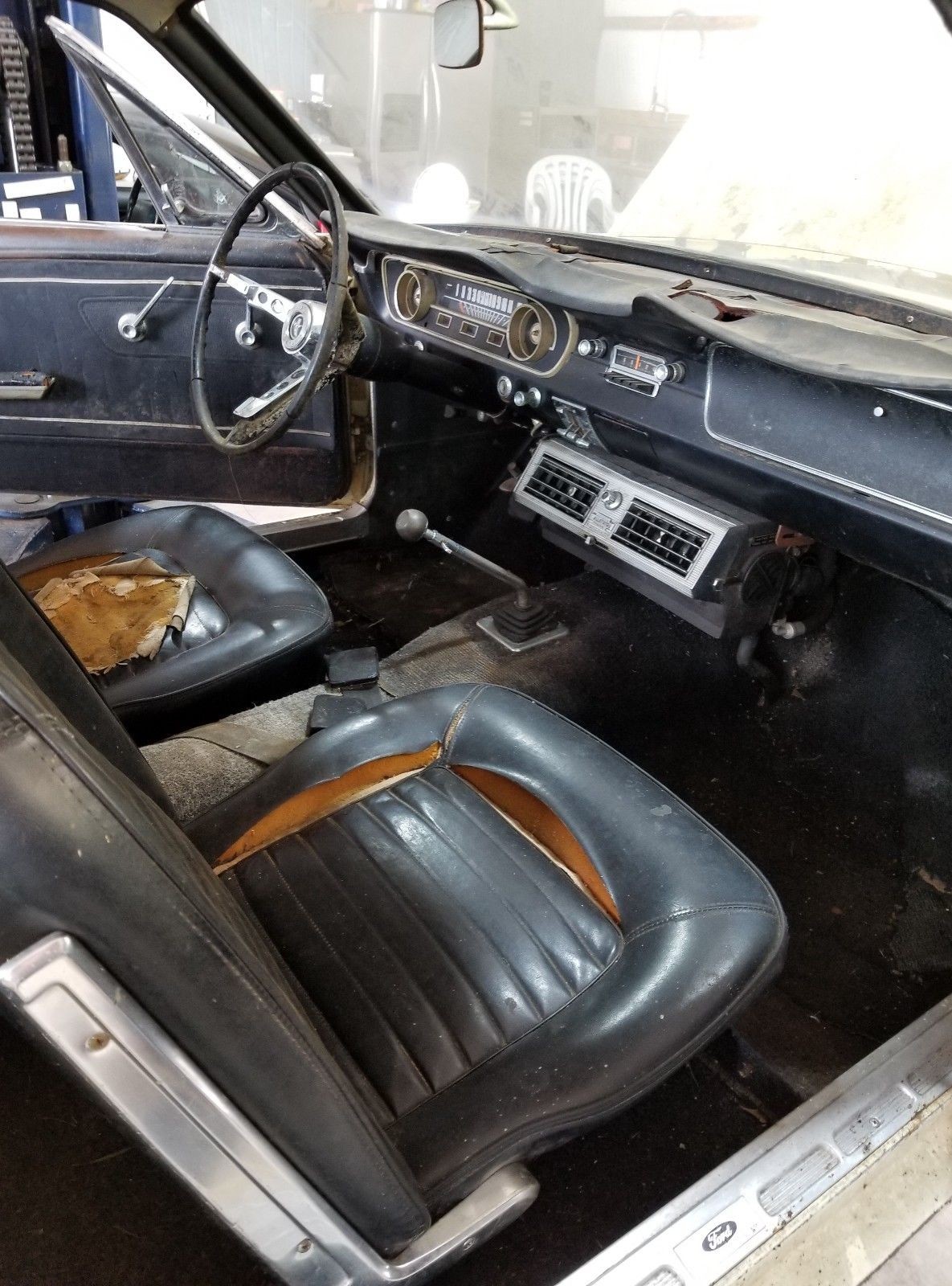 The condition of the car at first glance is a bit shocking. That first owner must have been Mr. Magoo, as it is hard to find a panel on this car that doesn’t have a dent or a wrinkle in it. Surprisingly, the rust we see is more surface rust than anything else. There is some rust bubbling at the bottom of the passenger side door and on the panel below the rear bumper. We have certainly seen worse on Mustangs of this era. When inspecting any early Mustang, always put it on a lift, bring a magnet, bring a Mustang expert, etc…
