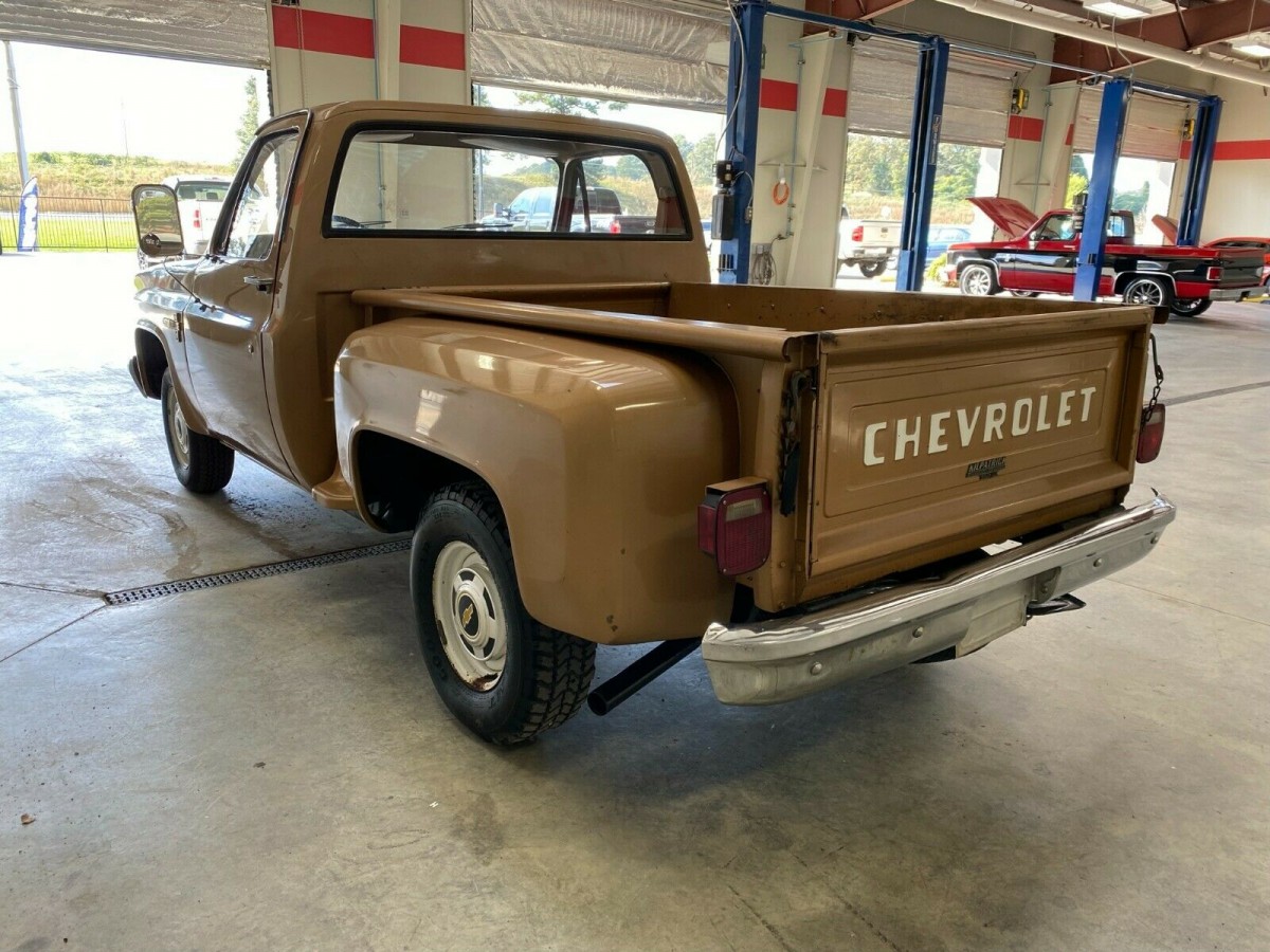 One of the more unique features of this C10 is the short bed step side feature. This can be a love-it-or-hate-it look, but for those who love it, this will often fetch a higher price. Speaking of the bed, you can tell this truck has been used as a truck. There are some scratches and surface rust, but nothing serious. I don’t know if the wood has been replaced, but it certainly looks solid. The rest of the body is overall pretty good, with minor wear around the rear fenders and the beginnings of rust bubbling in the bottom rear cab corners. However, the brown paint still is shiny, there are only a couple of minor dents on the chrome bumpers, and surprisingly the front valence appears undamaged. One thing that will probably annoy some people – the mirrors don’t match! The driver’s side has a larger one, and the passenger side has what looks to be a small aftermarket sport-type mirror.