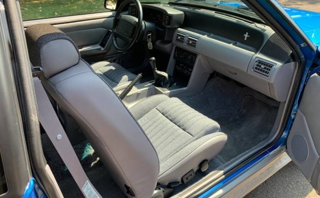 The interior of this Mustang is in spectacular condition, as you’d expect for this sort of mileage. The gray cloth seats show next to no wear and tear, and the same goes for every other touchable surface. The seller reports that equipment includes a sunroof, air conditioning, a power-adjustable driver’s seat, and a Traction-Lok limited-slip differential. And just to convince you that it was no accident that this ‘Stang was left new in the wrapper, the original date-coded tires from 1993 are included with the sale mounted on a spare set of 5-spoke alloy wheels. Yes, someone was slightly obsessive about preserving originality.