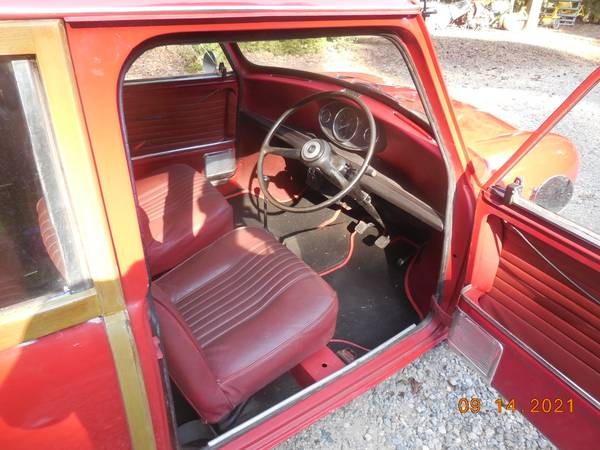 You gotta love the snug, utilitarian simplicity of the Mini’s red interior. Its front bucket seats and rear bench seat look original. There’s some fading and one photo shows a tear in the bottom cushion of the passenger seat, but overall the seats, door panels, dash, steering wheel, carpet, and paint look good.