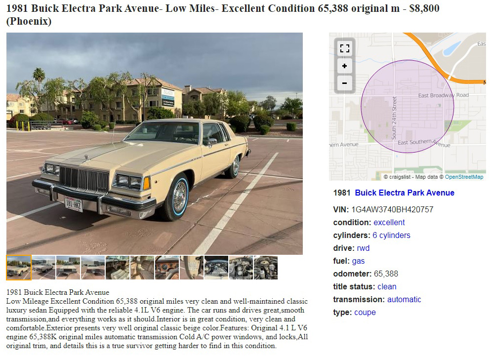 I’m not sure why there’s no rear license plate shown here, but they show a front license plate. Arizona doesn’t require a front license plate, but all states require one on the rear. Also, the new-looking blue-whitewall tires aren’t mentioned in the listing, but I’m guessing those are new. It’s hard to argue with this era of the Buick Electra Park Avenue, though; they’re typically very nice cars, and a two-door is an eye-catcher. This car is almost 19 feet long, so check your garage space first.