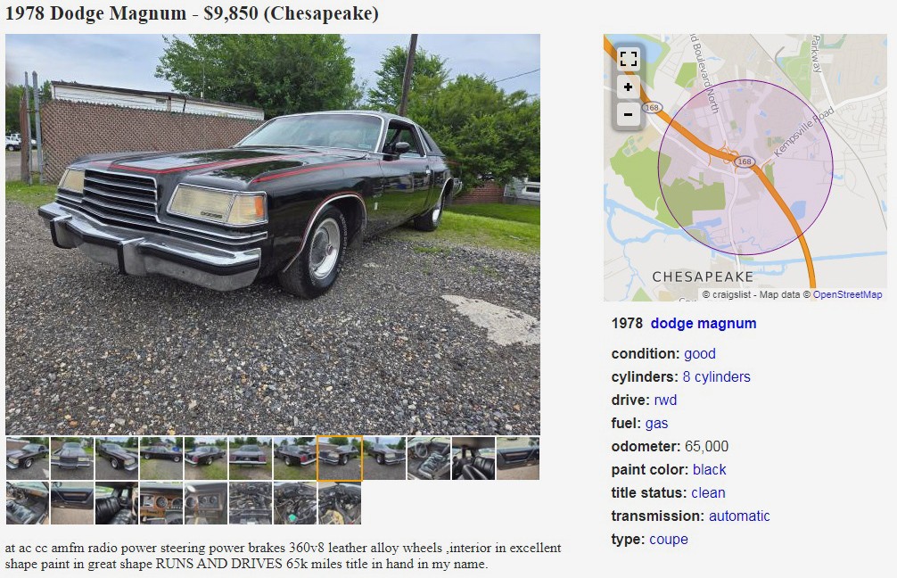 A Dodge Magnum XE brochure says this model “epitomizes the personal driving machine.” For 1978, I think they were onto something. The sad part, though, is that I was never, nor will I ever be, as cool as this guy. The seller has this personal driving machine 1978 Dodge Magnum XE, posted here on craigslist in Chesapeake, Virginia, and they’re asking $9,850. Here is the original listing, and this tip comes from a guy who is that cool: Tony P.!