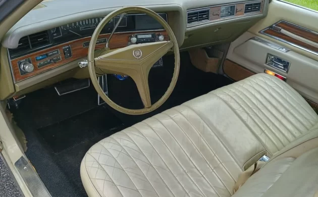 This Eldorado’s interior features the creature comforts that most buyers expected from a luxury vehicle in 1972. These include leather trim, climate-controlled air conditioning, power windows, power locks, cruise control, acres of faux woodgrain, a tilt wheel, and an AM/FM radio. I spotted an underdash CD player, which appears to be the only addition. The wheel is cracked, and some plastic pieces are dirty or discolored. However, the lack of carpet wear and the fact that the leather only exhibits age wrinkles seem to support the seller’s mileage claim. The dash and pad look excellent, as does the woodgrain.