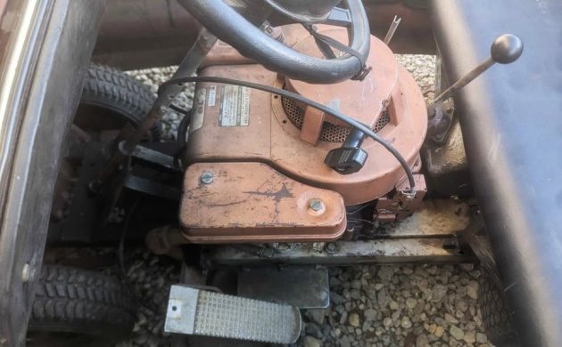 With the pole removed and no overhead system to provide electricity, this one now runs on a Briggs & Stratton gasoline engine, and the 7 HP rating sounds like plenty to get it moving capably. My biggest concern here is the mounting location, as it’s between the steering column and very near the seat, which could present a few potential safety issues. However, the padding has been retained on the steering wheel, so at least some parts of your body will be protected if there’s an accident.