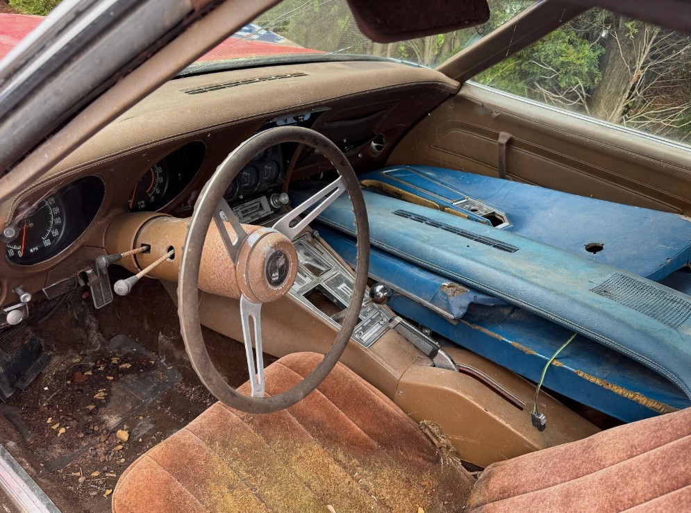 The other six Corvettes are all from 1971, 1972, or 1973. One of the ‘71s has bronze paint and is a 454 V8 car from the factory. Another is maroon with a 350 engine and a 4-speed transmission (could be an M22). The third is red in color with a 4-speed and a 502 (?) V8. Rounding out the 1971s is an example wearing blue paint and a 350 V8, considered a “work-in-progress”. Separate from the body is its full chassis.