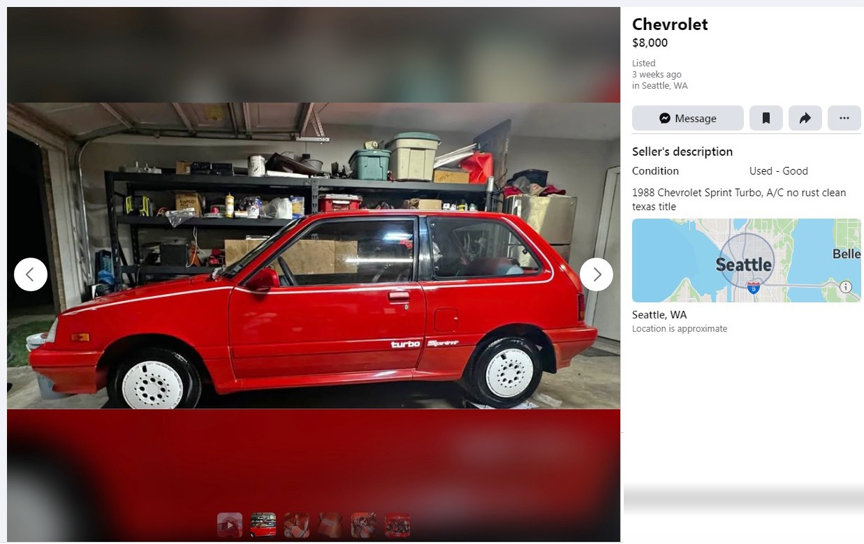 Looking like it’s been restored, this rebadged Suzuki Cultus turbo was known as the Chevy Sprint Turbo here, and the turbo version is the one you want. This 1988 Chevrolet Sprint Turbo is posted here on Facebook Marketplace in Seattle, Washington, and they say it has a clean Texas title. I’ll let you decipher that. The seller is asking $8,000, and here is the original listing. In case you’re wondering, the seller’s asking price is about what it cost new.