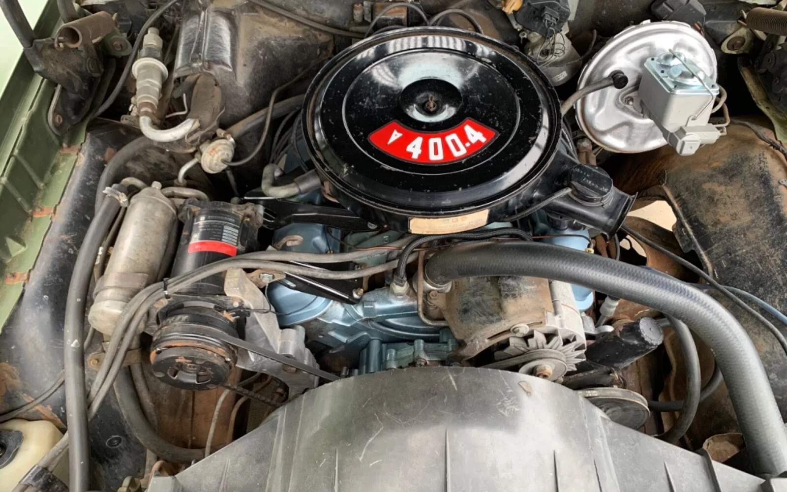 The original owner chose the hottest engine available in a LeMans Sport, the L78 400 “HO.” There are some discrepancies in power ratings; the brochure says that the four-barrel 400 in the Sport produced 330 horsepower and 445 lb.-ft. of torque, but at least one advertisement (and the eBay seller) claims that 345 horsepower was available (Hemmings says that the 345-horse 400 was available with a manual transmission). According to the brochure, the 330-horsepower engine was only available with a Turbo 400 and 3.08:1 rear axle ratio, but this car also has the $42.13 “Safe-T-Track” differential, so all-in-all, this is a potent combination. The engine itself is not the original unit; the block was replaced with a 400 from a ’74 Trans Am, but the original high-compression heads and carburetor were installed on the new short block. You’ve certainly noticed the air conditioning compressor; it blows “cool” but not cold, so it will need work. The master cylinder, fan clutch, and valve cover gaskets were recently replaced.