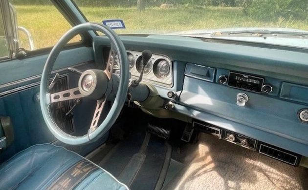 The interior is fantastic with more friendly blues in Cara Vinyl with this Native American pattern trim. They say the padded dash top is original and perfect, so that’s great news. The factory air-conditioning will need work as it isn’t blowing cold, but once it is, “it’ll freeze you out”, and I believe it. The driver’s seat has some cracking that we don’t see, but the back seat looks like new. This Jeep has just 76,387 miles on it.