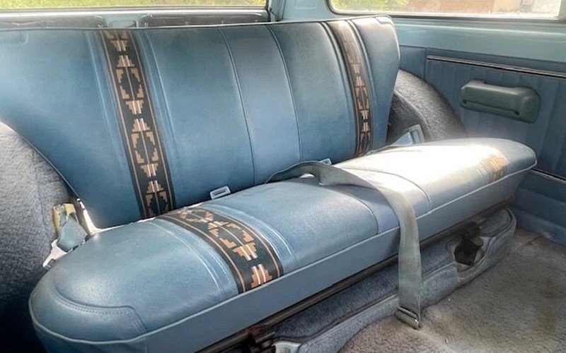 The interior is fantastic with more friendly blues in Cara Vinyl with this Native American pattern trim. They say the padded dash top is original and perfect, so that’s great news. The factory air-conditioning will need work as it isn’t blowing cold, but once it is, “it’ll freeze you out”, and I believe it. The driver’s seat has some cracking that we don’t see, but the back seat looks like new. This Jeep has just 76,387 miles on it.