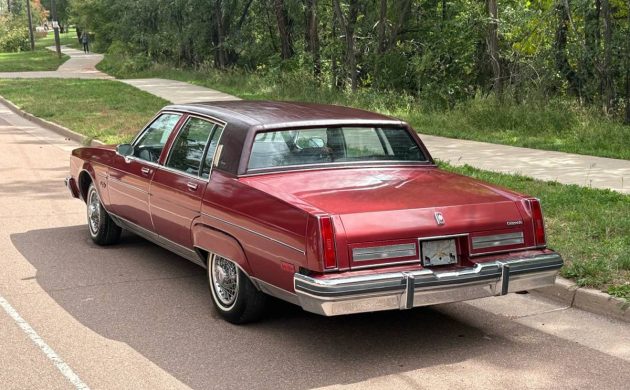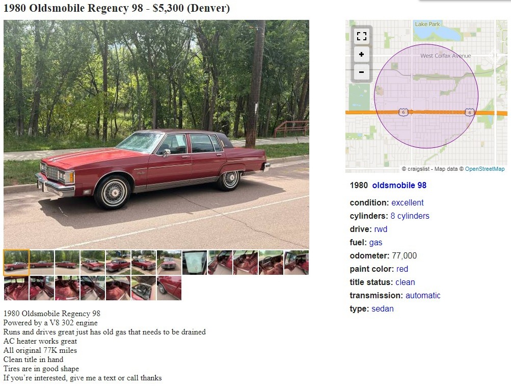 Denver is known for snow, but I didn’t expect to see surface rust under the hood. This is Oldsmobile’s 307-cu.in. OHV V8, new for 1980. It had 150 horsepower and 245 lb-ft of torque when new and sent power through a THM-350 automatic to the rear wheels, as was often the case in 1980, although the times, they were a’changin’. The seller says this one works great, and even the AC works (!), but the fuel system needs to be drained due to old gas being in there for too long. This car was just over $12,000 new (window sticker in the photo gallery), which is just over $47,000 today. What are your memories of 1980, if you were around back then?