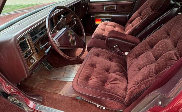The bumper filler material and missing door trim in a couple of spots are the biggest things I see on the exterior that need help. The interior looks great overall, with some loss of padding on the driver’s seat that can be fixed by any good upholstery shop. The Dark Claret velour seats look nice otherwise, and they go well with the Dark Claret paint. The back seat should have enough room for almost anyone, even a recently graduated, tall, lanky “rock star wannabee” 17-year-old who graduated a year early, despite goofing off the last couple of years of high school.