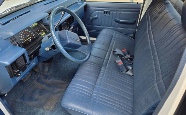The interior is exactly what you’d expect from a base compact pickup with a radio and power steering as the only two options on the window sticker. While I’ve never been a big fan of white cars, harmonizing blue interiors look the best (in my opinion). With a bit of detailing, this interior will look like new.