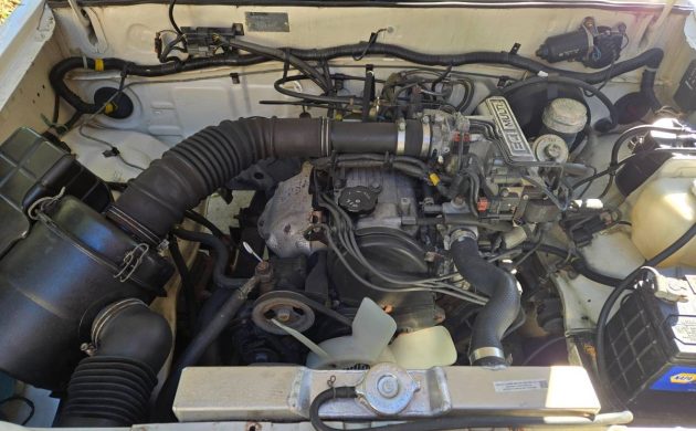 That engine is a 2.4-liter overhead-cam four cylinder with 116 horsepower. Everything looks stock in here except for, if I’m looking at things correctly, an aftermarket aluminum radiator. Like it or not, 1990 was 35 years ago, so a leaking original radiator is not as outlandish as it might seem for those who still think of the 1990s as yesterday. The upper radiator hose also looks new, so perhaps this truck benefitted from some cooling system maintenance – one less thing for the buyer to do. Notice the quaint mechanical clutch fan, an effective device from the days before the now-ubiquitous electric fan came along and hogged your amperage. Typically, a clutch fan is used in combination with a fan shroud, but pictures I’ve found online suggest otherwise for the Mighty Max.
