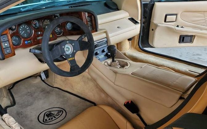 Moving inside is a very clean buckskin environment, a tough shade to keep clean. And, it has been enhanced with Lotus Elise seats. The original, very worn, Esprit seats are included in the sale. The new seat upholstery shade may not match perfectly but it is similar and certainly works well enough. From the two included images, the interior, much like the exterior, appears to need nothing. As is often the case with British sports cars, there is a very purposeful instrument panel in place; we’ll have to assume that the multitude of gauges work as they are supposed to. Considering what we know and can observe, it makes me wonder why the seller only rates the inside as a 6 out of 10?