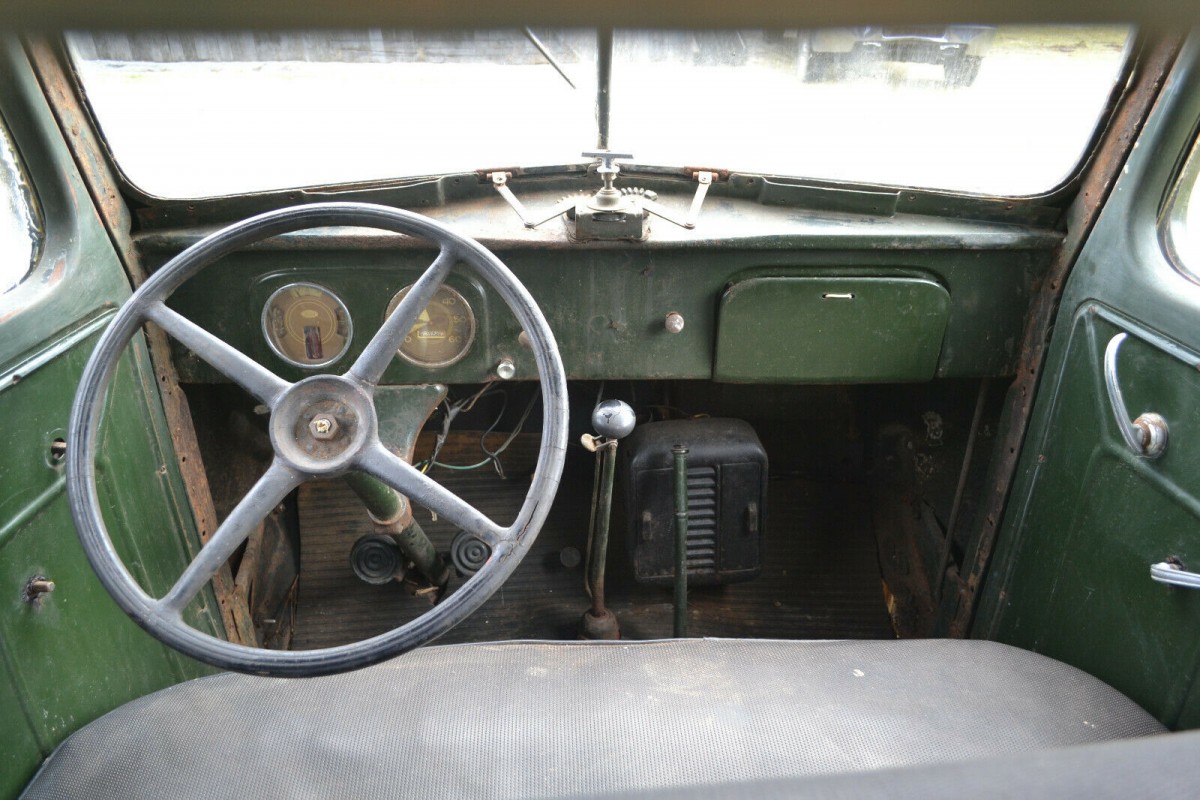 The spartan interior is actually quite attractive in an art deco way. The four-spoke steering wheel is in good condition, missing only the center button, and will be easily refurbished. The optional heater still hangs under the dash, and gauges are complete. The clutch is situated to the left of the steering column, with the brakes and accelerator on the right along with the floor starter pedal. Bench seat upholstery is in good condition, though it’s hard to imagine it hasn’t been replaced over the many decades of use.