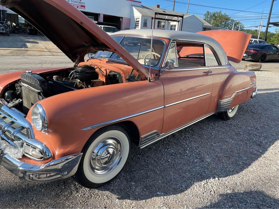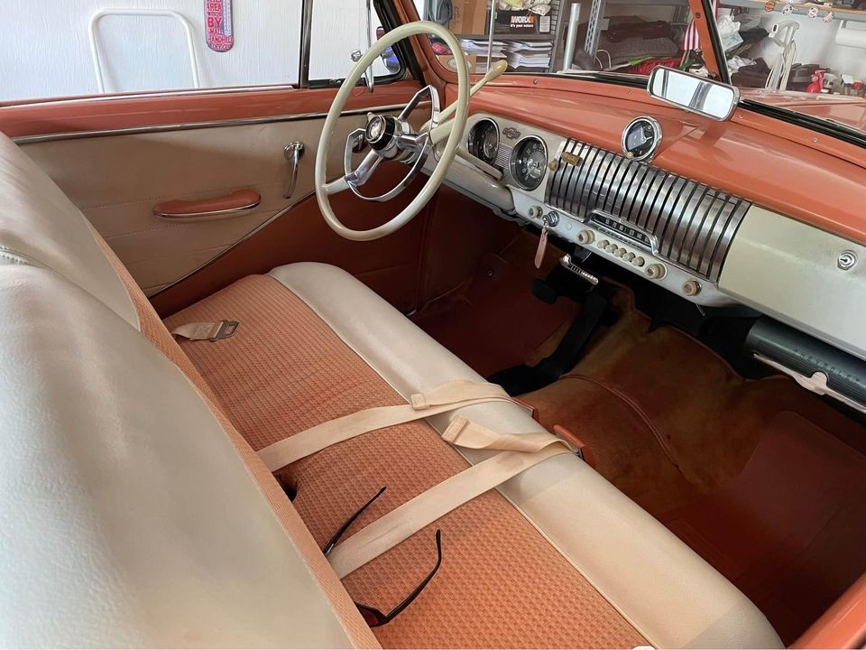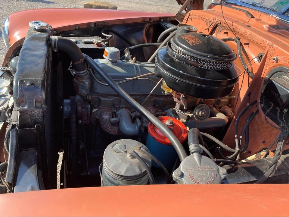 The two-tone “coral and white” theme is carried inside as well with an interior that looks remarkable for a 69-year-old car. There are a few stretch marks in the orange fabric of the bench seat, but that’s about all I can spot from the two photos. It’s even sporting the De Luxe Steering Wheel which was described as “ultra-modern with a medallion center,” an electric clock mounted in the center of the dashboard, and a tissue dispenser. There are no photos of the rear seat or headliner.